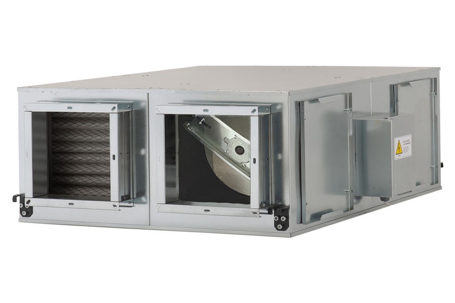 Ceiling Type Heat Recovery Device (Energy Saving Plug Fan+Aluminum Heat Exchanger for Long Life) Plug Fan Aluminum or Galvanized Sheet Metal. (Backward Curved). Low energy consumption. G4 type for prefiltration. Control panel can operate both sides flow rate with adjustable stages, Can control electric heater. 10mm thick material inside unit for heat and noise insulation.